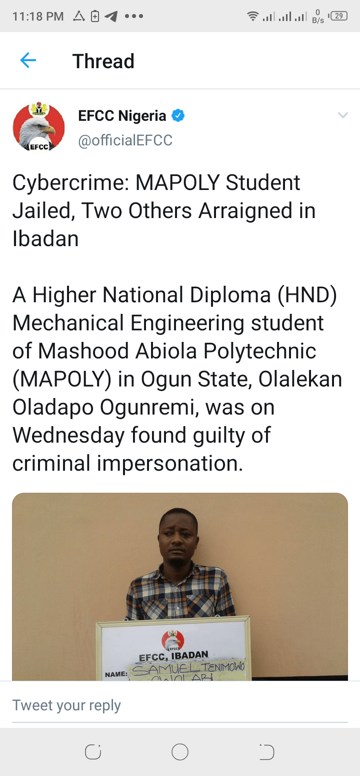 The information which was contained in a series of tweets by the verified Twitter handle of Nigeria’s Anti Graft Agency, Economic Financial Crimes Commission (@officialefcc) and contained in reports on various media platforms drew the irk of students of the polytechnic who accused EFCC and media of sheer mischief.